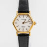The engraved gold-tone case showcases intricate Art Deco detailing along the bezel, complementing the curved crystal and rectangular silhouette. The silver-tone dial features raised gold Arabic numerals, elegant syringe hands, and a crisp sub-seconds dial at 6 o’clock—emphasizing both function and charm.