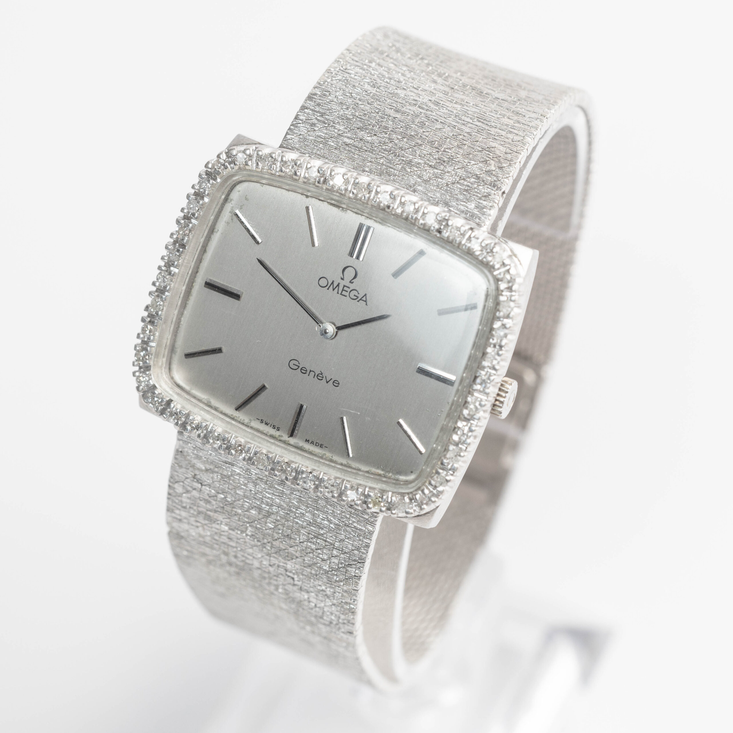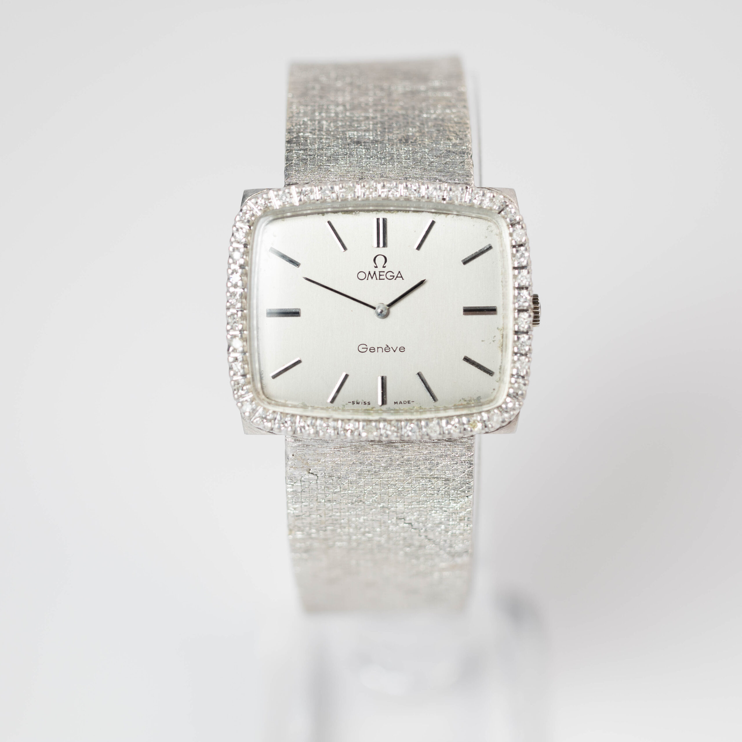A striking and elegant Omega Genève Ref. 111.0109 (1971) featuring a distinctive 36 × 31 mm rectangular case and original silver dial. This piece was customized in period fashion, highlighted by a diamond-set bezel that adds sophistication while maintaining Omega’s refined aesthetic.