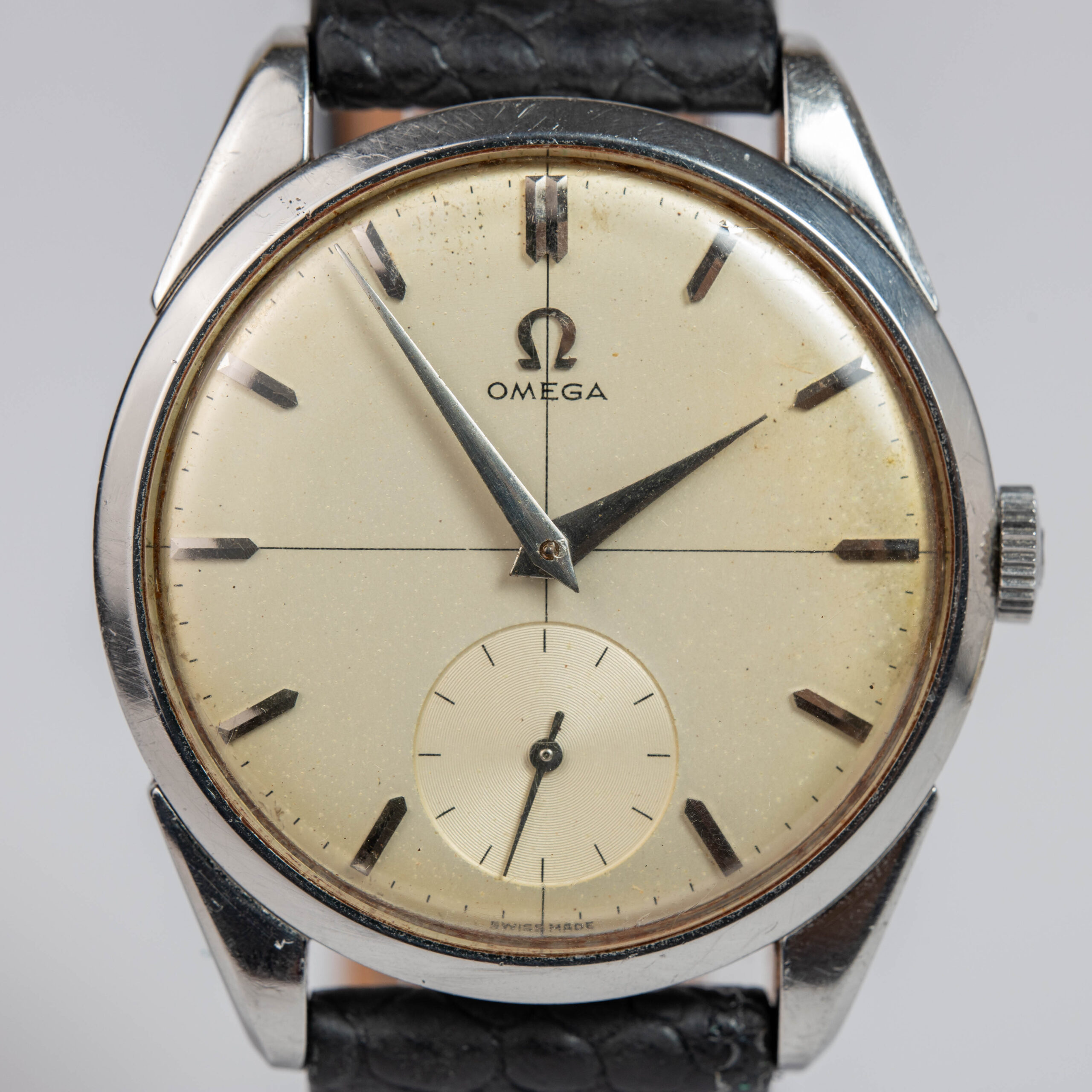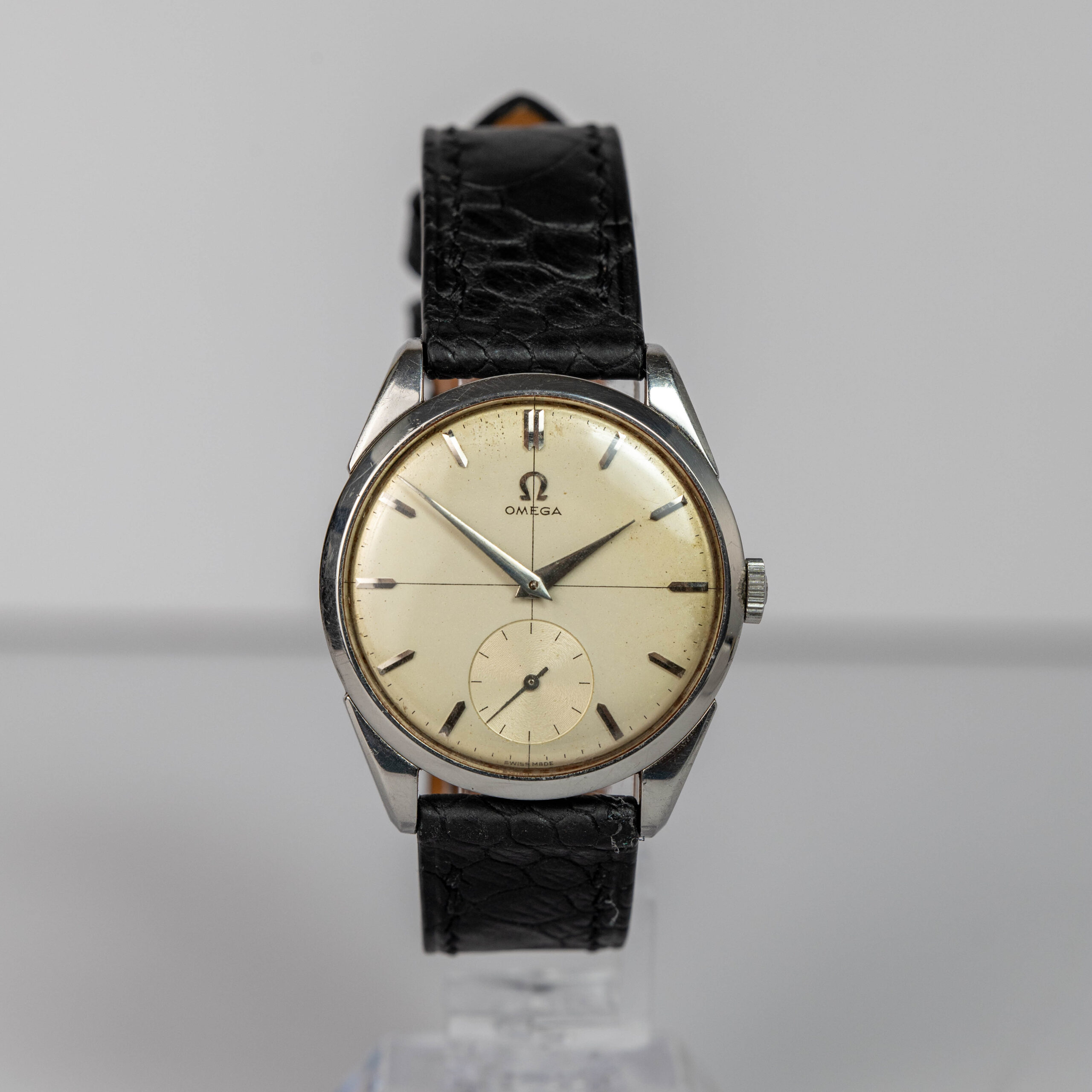 A striking example of post-war simplicity and elegance, this vintage Omega is a pure, two-hand dress watch from 1956. With its clean cross-hair dial and classic small seconds sub-dial, it represents the timeless style of Omega’s manual-wind era.