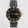 Dial: Gloss black dial with applied gold-tone hour markers and matching gold script